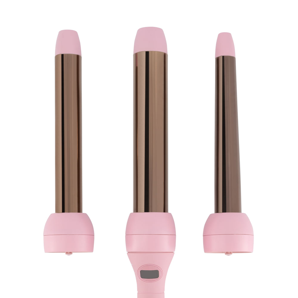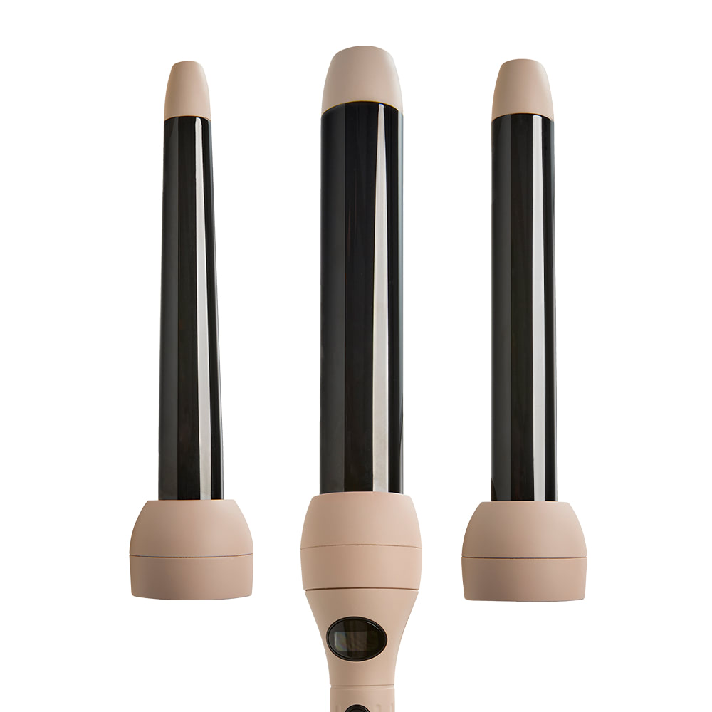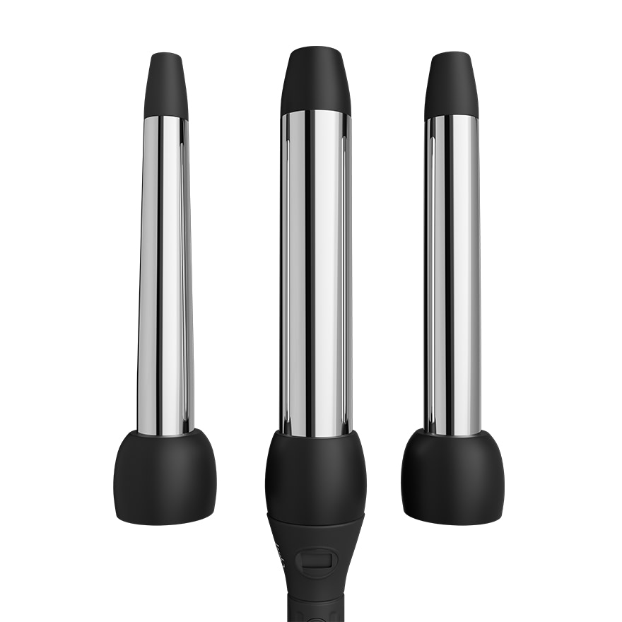 Style your way every day with a capsule curl collection. This curler set has three uniquely sized and shaped interchangeable titanium barrels to create beachy waves, loose curls or bouncy, full-bodied spirals.